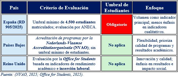 La siguiente tabla compara los enfoques de evaluación de universidades privadas en España, Países Bajos y Reino Unido: