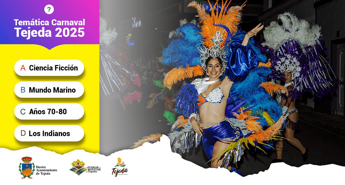 El sábado 5 de abril de 2025 Tejeda celebrará sus CARNAVALES y queremos que nuestros vecinos y vecinas, así como simpatizantes del municipio escojan la TEMÁTICA entra las siguientes opciones: