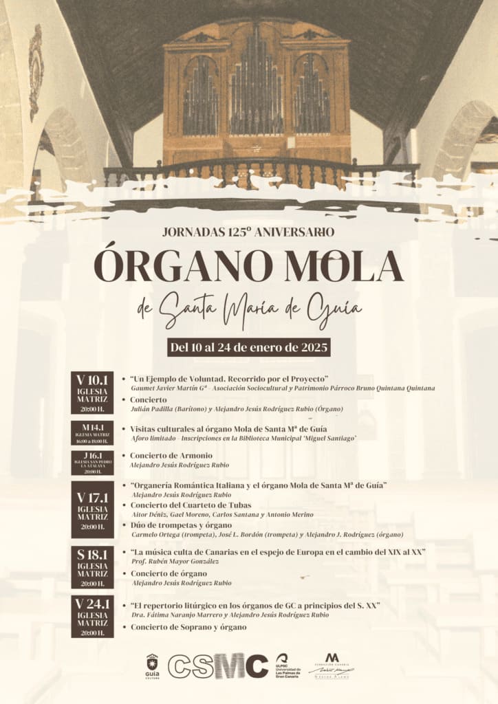 Ya el viernes 17 de enero, a partir de las 20:00 horas, se llevará a cabo una nueva conferencia, titulada: “Organería Romántica Italiana y el órgano Mola de Santa María de Guía”, de la mano Alejandro Jesús Rodríguez Ruiz. Tras la misma, actuará el Cuarteto de Tubas, compuesto por Aitor Déniz, Gael Moreno, Carlos Santana y Antonio Merino, y el Dúo de trompetas y órgano, que forman los trompetistas Carmelo Ortega y José L. Bordón, y el organista Alejandro Jesús Rodríguez Rubio.