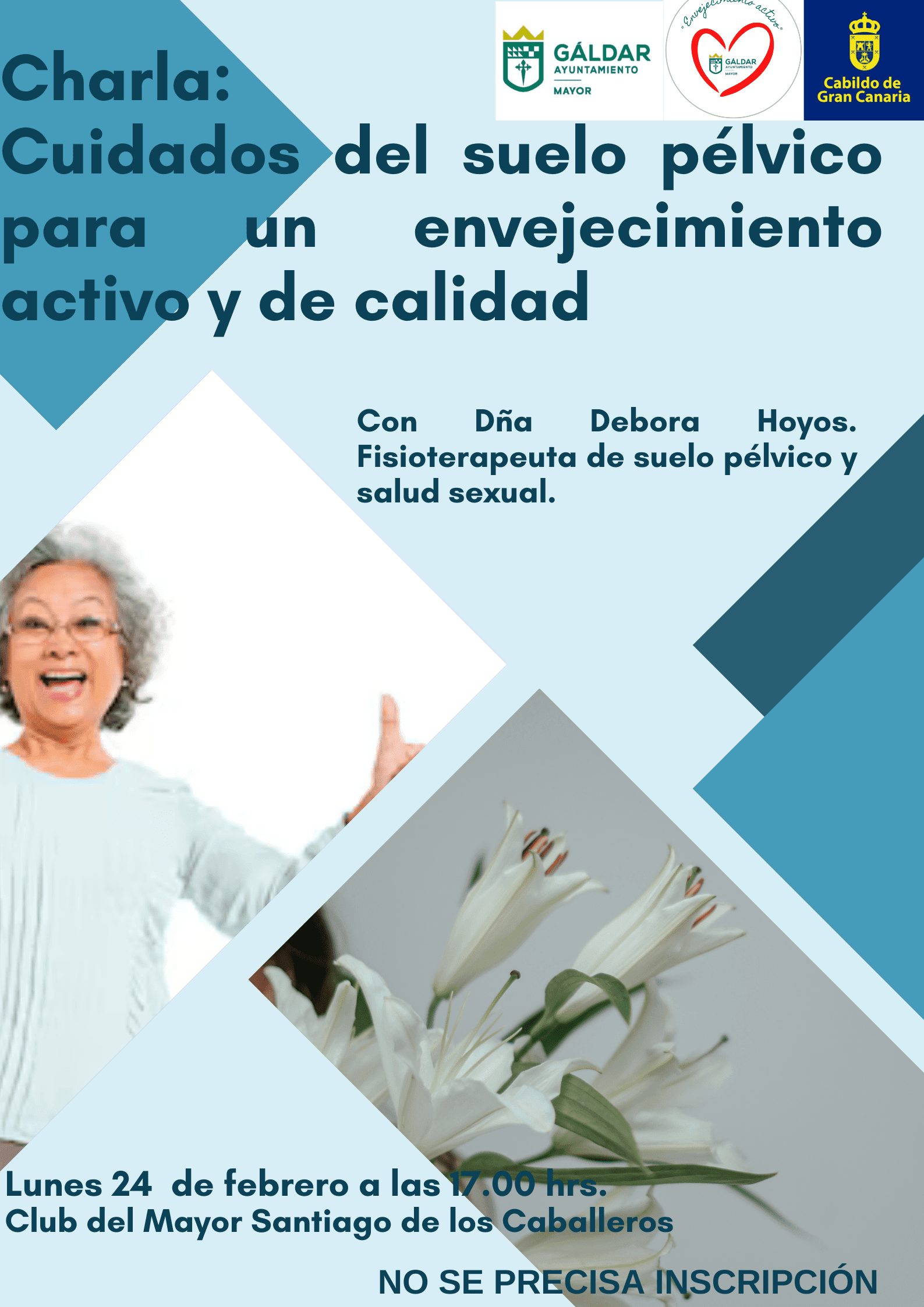 El proyecto Envejecimiento Activo de la Concejalía del Mayor del Ayuntamiento de Gáldar, coordinado por Dolores Delgado Jorge, organiza una charla titulada ‘Cuidados del suelo pélvico para un envejecimiento activo y de calidad’, impartida por la ponente Debora Hoyos el día 24 de febrero a las 17.00 horas.