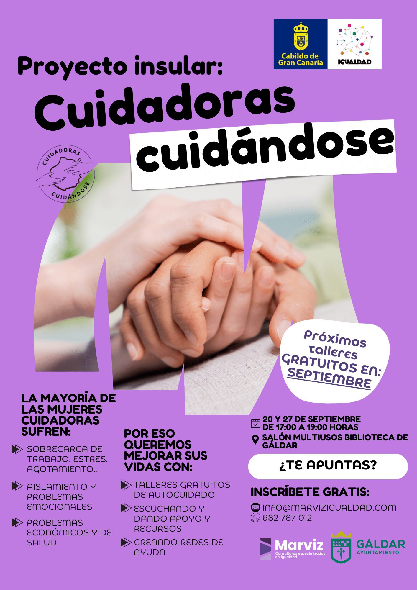 Gáldar acogerá los viernes 20 y 27 de septiembre dos talleres del proyecto insular ‘Cuidadoras Cuidándose’. Se trata de un proyecto del Cabildo de Gran Canaria que cuenta con la colaboración del Ayuntamiento de Gáldar y ejecutado por Marviz. Los talleres se van a realizar el 20 y 27 de septiembre de 17.00 a 19.00 horas en el salón multiusos de la Biblioteca de Gáldar. Las inscripciones pueden realizarse por Whatsapp a través del teléfono 682787012 o correo electrónico a info@marvizigualdad.com y es necesario rellenar el formulario de inscripción de este enlace https://forms.gle/razTNqrEAG25mSv76.
