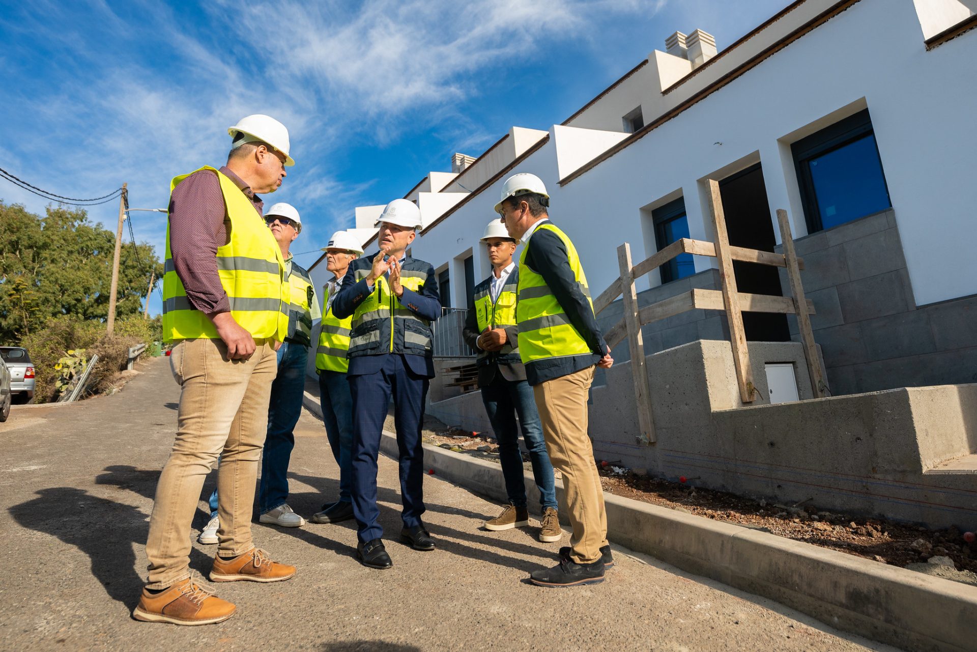 El consejero de Obras Públicas, Vivienda y Movilidad del Gobierno de Canarias, Pablo Rodríguez, ha visitado hoy las obras de construcción y rehabilitación de siete viviendas de promoción pública en Caideros de Gáldar, cuya ejecución ha alcanzado ya casi el 80%. En la visita han participado también el director del Instituto Canario de la Vivienda (ICAVI), Antonio Ortega; el alcalde de Gáldar, Teodoro Sosa; el concejal de Medianías; el concejal de Vivienda, Eleazar Miguel Rodríguez, y el presidente de la Asociación de Vecinos, José Mendoza.