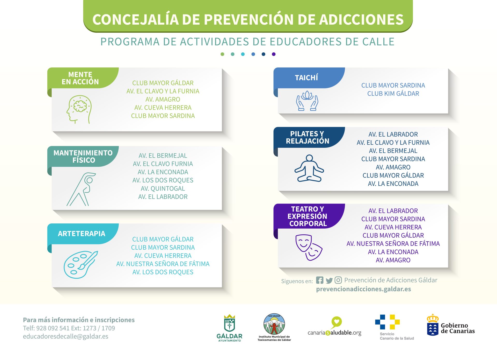 El programa ‘Educadores de Calle’, impulsado por la Concejalía de Prevención de Adicciones del Ayuntamiento de Gáldar, dirigida por Nuria Esther Vega Valencia, dará comienzo a sus talleres la semana del 22 al 26 de septiembre del 2025.