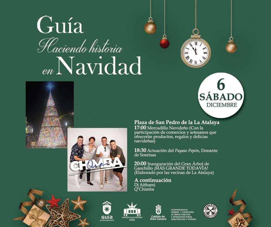 La programación navideña de Santa María de Guía continúa este fin de semana con una amplia oferta de actividades dirigidas a público de todas las edades. Uno de los momentos más destacados tendrá lugar este sábado 6 de diciembre, en la Plaza de San Pedro de La Atalaya, con el encendido, a las 20:00 horas, del Árbol de Navidad de Ganchillo, que este año alcanza los 10 metros de altura. La pieza, decorada con miles de rosetas tejidas a mano por las vecinas del barrio, refleja un magnífico ejemplo de creatividad y trabajo en comunidad que añade un valor singular a la decoración navideña de este barrio.