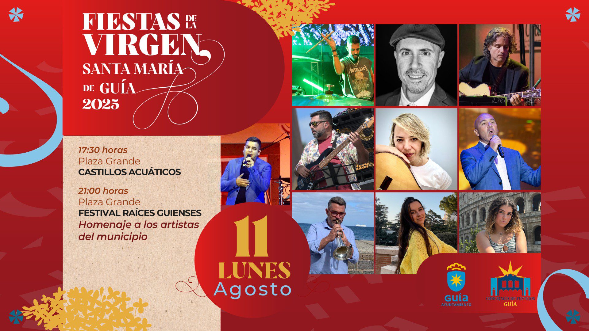 En el marco de las fiestas patronales de La Virgen 2025, la Plaza Gran de Guía acogerá hoy lunes, a partir de las 21:00 horas, la quinta edición del Festival Raíces Guienses, un espectáculo que se celebrará en la Plaza Grande de Guía a partir de las 21:00 horas. Este emblemático espacio del casco histórico volverá a reunir a destacadas voces y músicos nacidos en el municipio o con un profundo vínculo con él.