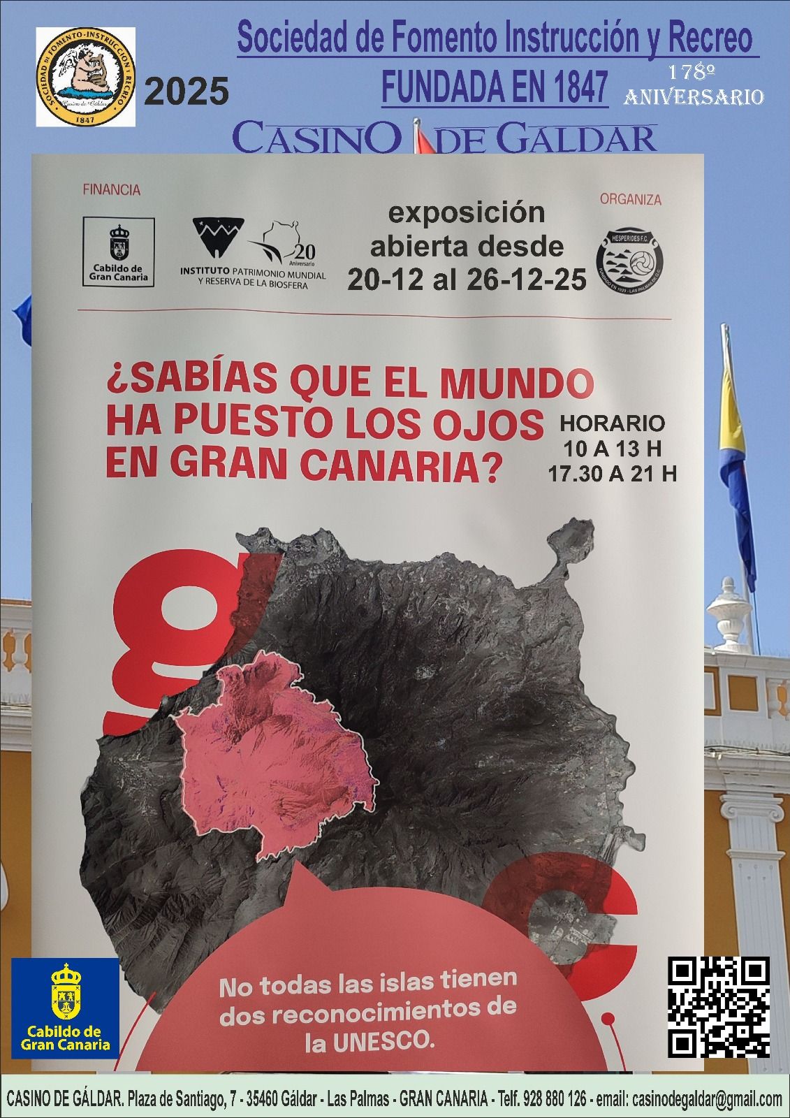 Desde el pasado 20 de diciembre y hasta este viernes 26, el Casino acoge la exposición de carácter divulgativo: “¿Sabías que el mundo ha puesto los ojos en Gran Canaria?”. La muestra, que cuenta con la financiación del Cabildo de Gran Canaria y el Instituto del Patrimonio Mundial y Reserva de la Biosfera, subraya los dos reconocimientos de la UNESCO que ostenta la isla.
