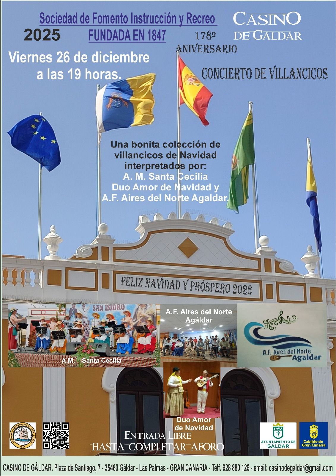 El mismo viernes 26 de diciembre, a las 19:00 horas, el sonido de las cuerdas y las voces tradicionales tomarán el protagonismo en el salón principal. El Casino de Gáldar ofrecerá un Concierto de Villancicos con un cartel de lujo que reúne a destacados grupos de la escena local:
