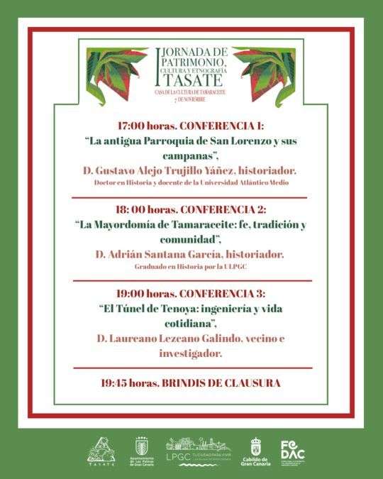 La jornada comenzará a las 17:00 horas con la conferencia “La antigua Parroquia de San Lorenzo y sus campanas” a cargo de Gustavo Alejo Trujillo Yáñez, Doctor en Historia y Profesor de Didáctica de las Ciencias Sociales en la Universidad del Atlántico Medio. Le seguirá Adrián Santana García, Graduado en Historia por la Universidad de Las Palmas de Gran Canaria (ULPGC), con la ponencia “La Mayordomía de Tamaraceite: fe, tradición y comunidad”. A las 19:00 horas, toca el turno de la conferencia “El Túnel de Tenoya: ingeniería y vida cotidiana”, a cargo de Laureano Lezcano Galindo, vecino de Tenoya e investigador. Finalizará la jornada con un brindis de clausura de productos canarios.