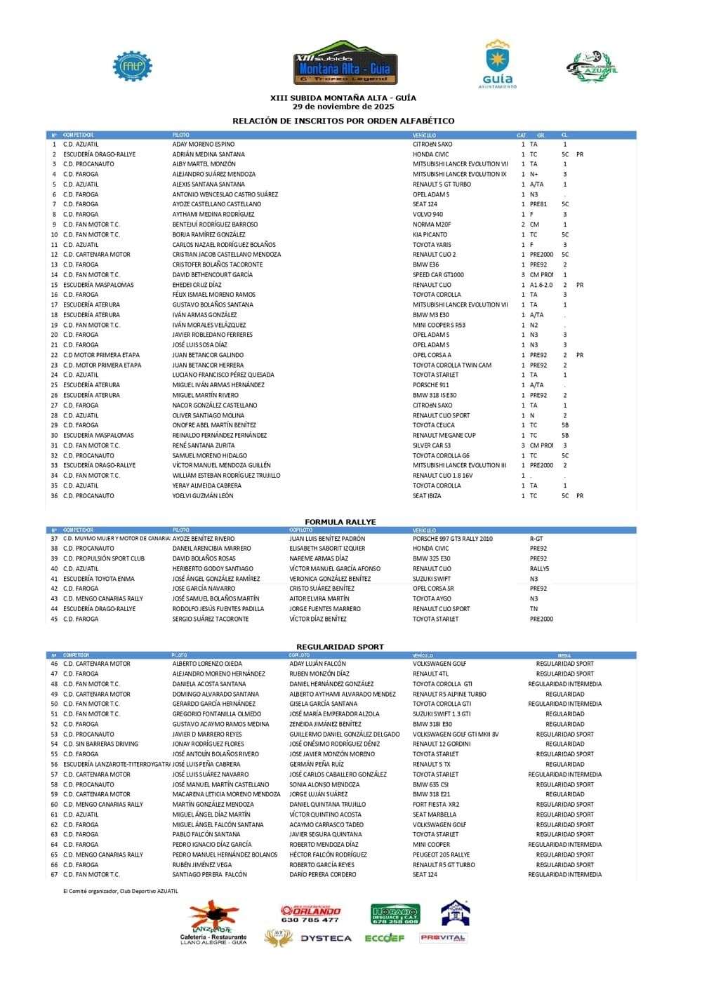 previo se dedica a las verificaciones y entrega de documentos a los participantes, de 17 a 20 horas, en el parking de la zona de servicios de la Urbanización Llano Alegre de Guía, donde también estará situada la oficina de la prueba, en el local de la Cafetería Lanzarote, colaboradora con la subida. Las zonas de asistencia serán repartidas en dos puntos, antes de la Salida (velocidad) y después de la Meta (RS y FR). Y por último, la entrega de trofeos al final de la jornada será en la Casa de la Cultura de Guía.