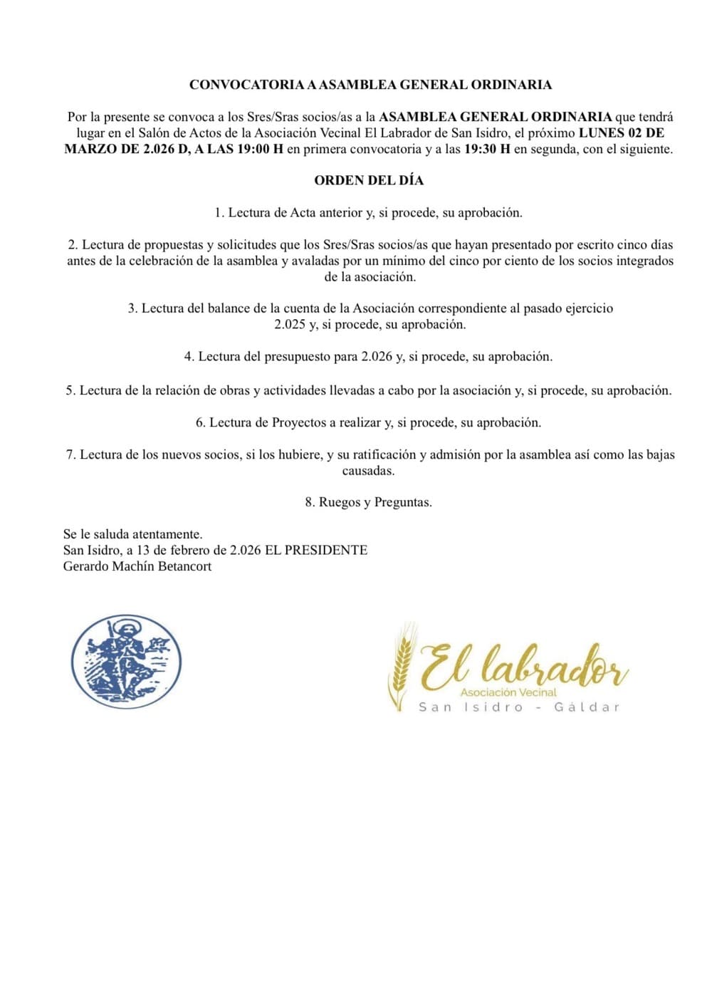 La Asociación Vecinal El Labrador de San Isidro ha anunciado la convocatoria de su Asamblea General Ordinaria, que se celebrará el próximo lunes 2 de marzo de 2026 en el salón de actos de la propia asociación. La reunión tendrá lugar en primera convocatoria a las 19:00 horas y en segunda convocatoria a las 19:30 horas.