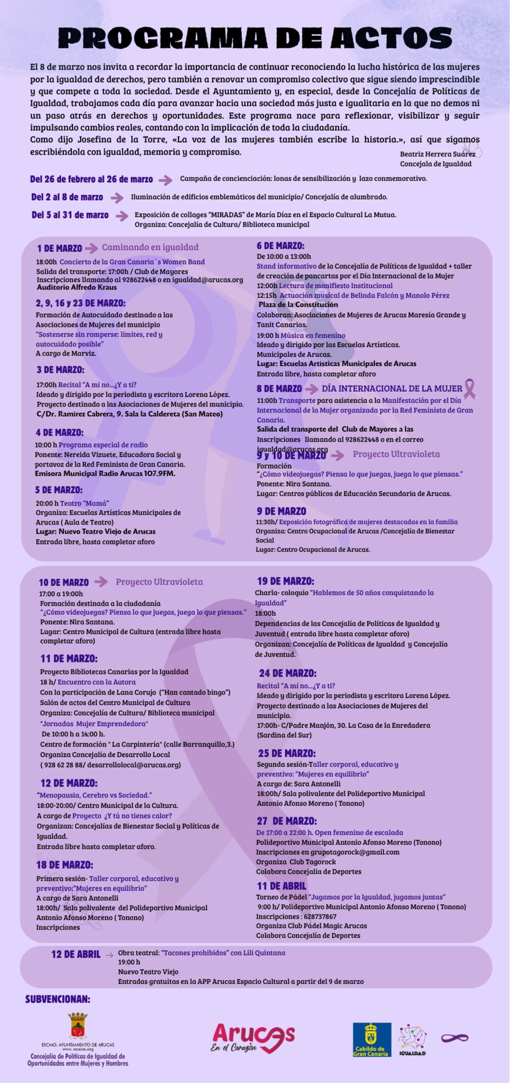 Desde El Ayuntamiento de Arucas se invita a la ciudadanía a participar activamente en las actividades programadas, que son todas gratuitas, con entrada libre hasta completar el aforo o con inscripción previa, cuando así se requiera (ver programa).