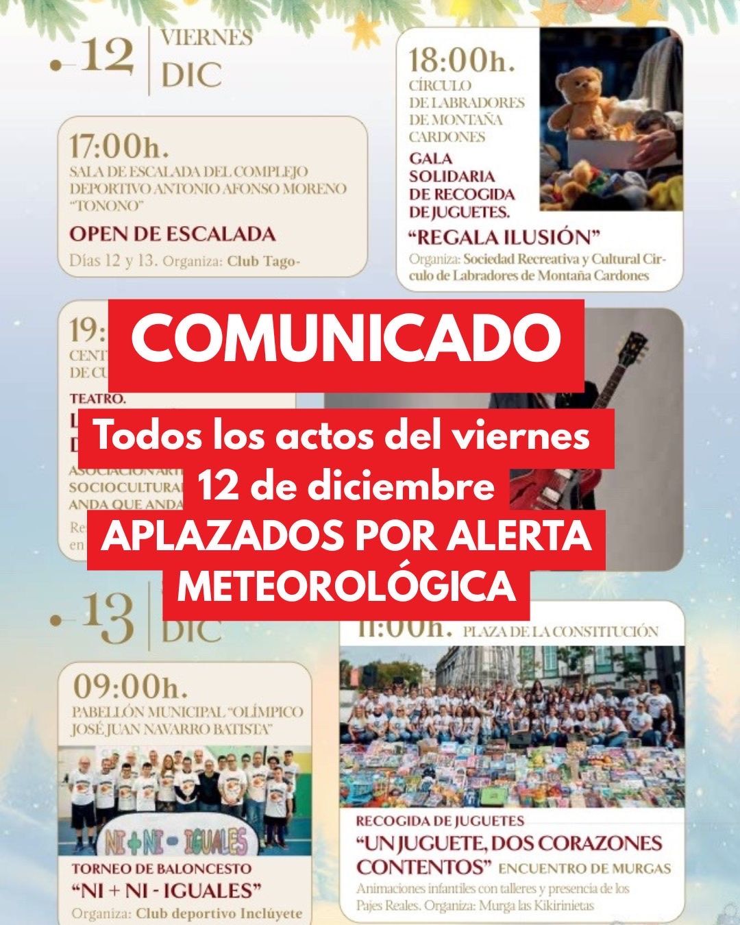 El Ayuntamiento de Arucas informa que la visita institucional prevista para hoy al Pasaje Venezuela, con motivo de la finalización de las obras del Paseo Peatonal con Carril Bici en Santidad, queda cancelada debido a la situación de alerta por fenómenos meteorológicos adversos provocados por la borrasca Emilia.
